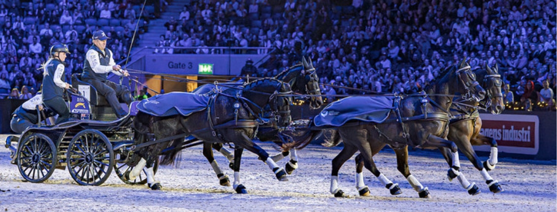 The Strawberry Arena was packed to the roof with Driving fans on Saturday to enjoy the second day of competition, after Day 1 saw Exell take the lead. Dutch course designer Johan Jacobs set a closely spaced track, with two sets of marathon boxes connected by a bridge in the stadium festively decorated for the winter holidays.