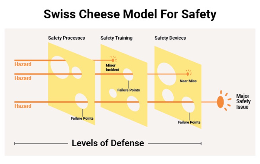 Used here for the purpose of illustration rather than rigorous application of the model; the “Swiss Cheese Model” of accident causation likens the process and procedures we put in place to reduce the chance of an accident happening to layers of Swiss Cheese. The size of the holes represents each layer’s effectiveness (or lack thereof) in preventing an incident. The larger the holes the greater the chance of lining up and allowing incidents to happen-the same logic applies to the effectiveness of mitigation processes.